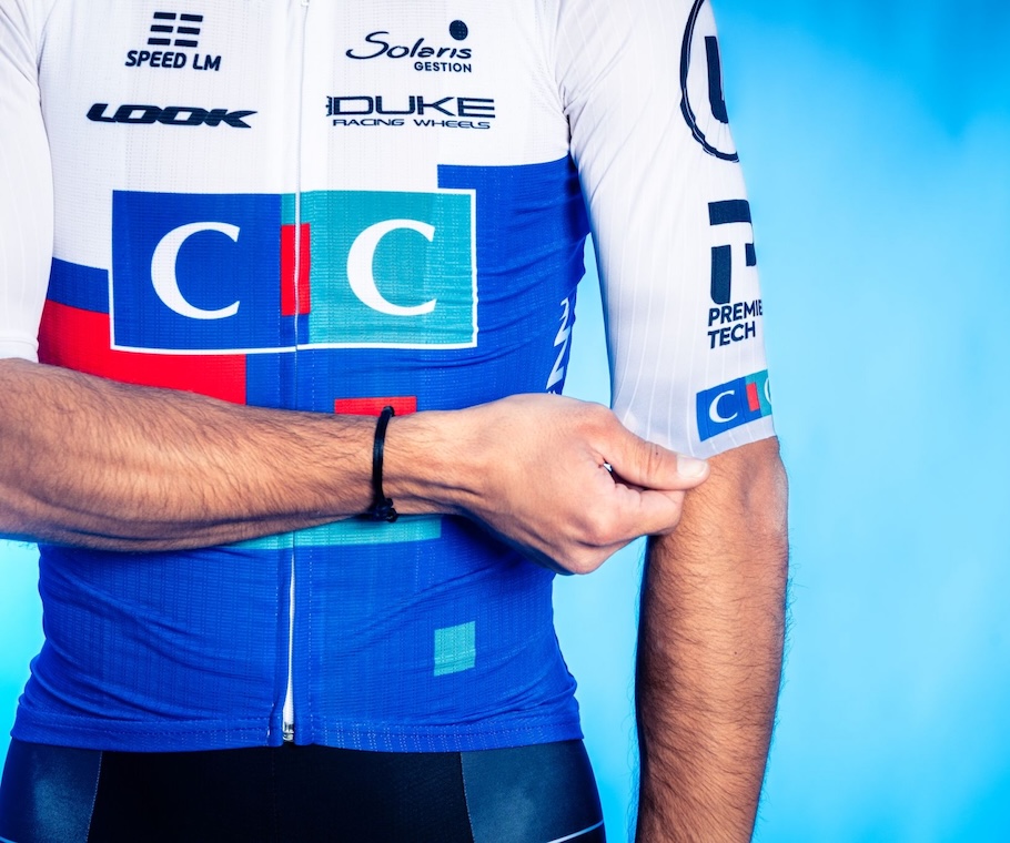 Notre évidence : un maillot blanc avec les couleurs du CIC et un cuissard noir. Nous avons repris les blocs de leur identité, qui s’assemblent. Pourquoi ? Parce que le CIC construit pour que le monde bouge et construit avec le monde du sport. Une arme visuelle, lisible dans le peloton, visible à la TV et surtout reconnaissable vue d’hélicoptère. La tenue n’est bien évidemment pas seule, elle est accompagnée d’une identité globale, déclinée sur toutes les supports physiques et digitaux : véhicules, documents, réseaux sociaux, …